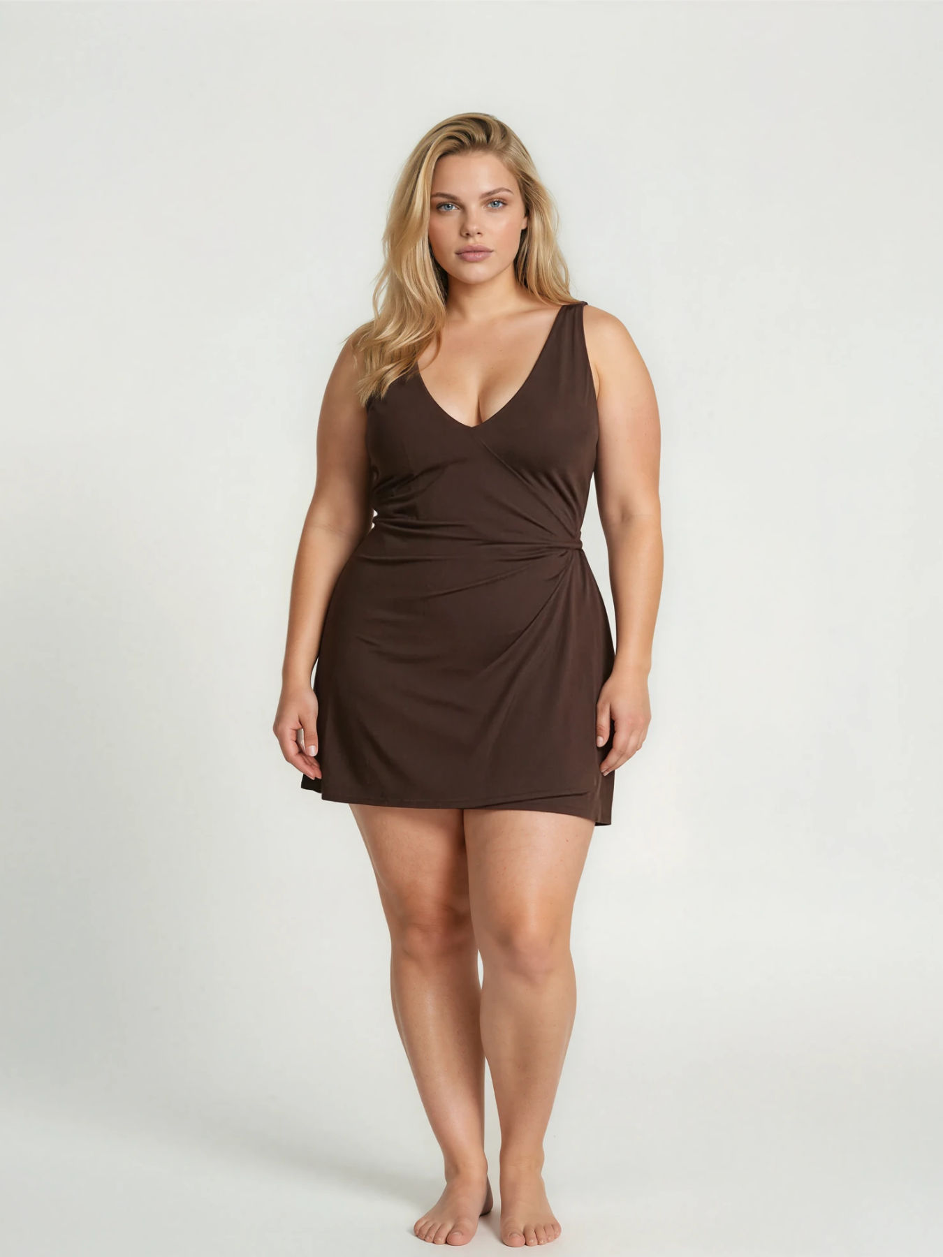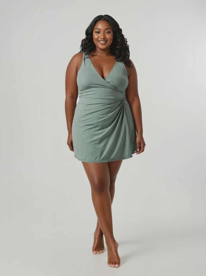 This flattering swim dress features an overlapping skirt with a soft, decorative side tie and hidden bikini bottoms for confident coverage. No-fuss wrap look, perfect for water and beyond. With adjustable straps and removable cups, it offers a customizable fit that feels as good as it looks—whether you're swimming, lounging, or chasing the sun.