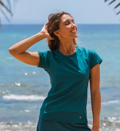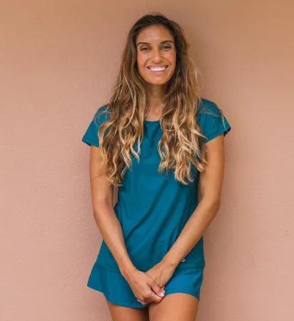 Beat the heat and the sun with the Loose Fit Adele Swim Top! This stylish crew neck with slimming adjustable side ruching is perfect for the pool, beach, or running around on a sunny day - did we mention it also has UPF 50+ sun protection? Sold as top only. Pair with your favorite swim bottom to complete the look.
