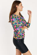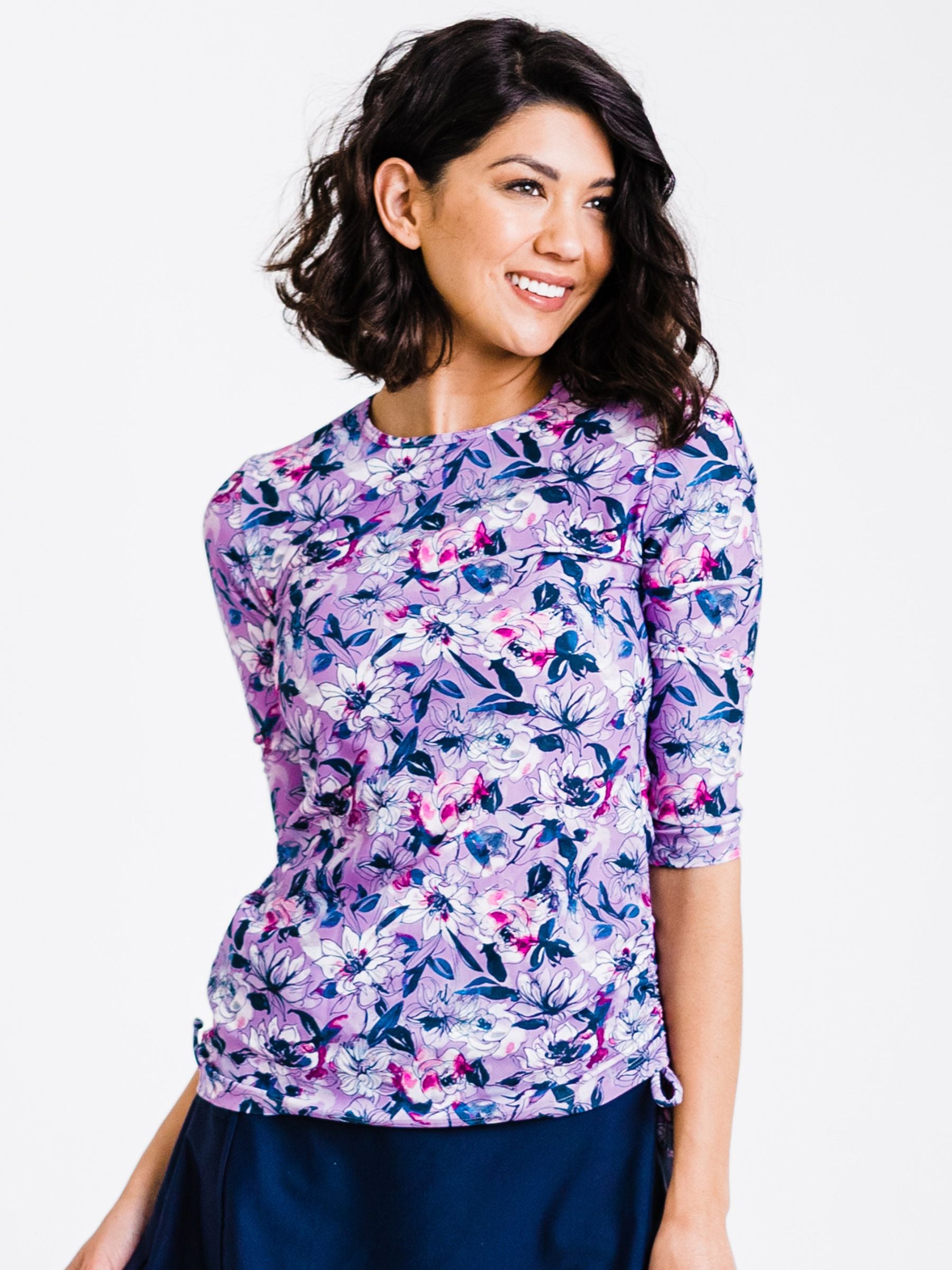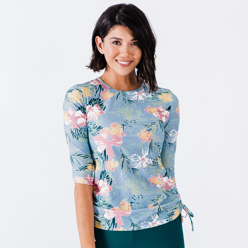 This round neck, 3/4 sleeve swim top is a must-have for a day in the sun. Complete with side ruching and UPF 50+ sun protection, the Margaux Swim Top is perfect for swimming, hanging by the water and water sports. Sold as top only. Pair with your favorite swim bottom to complete the look.