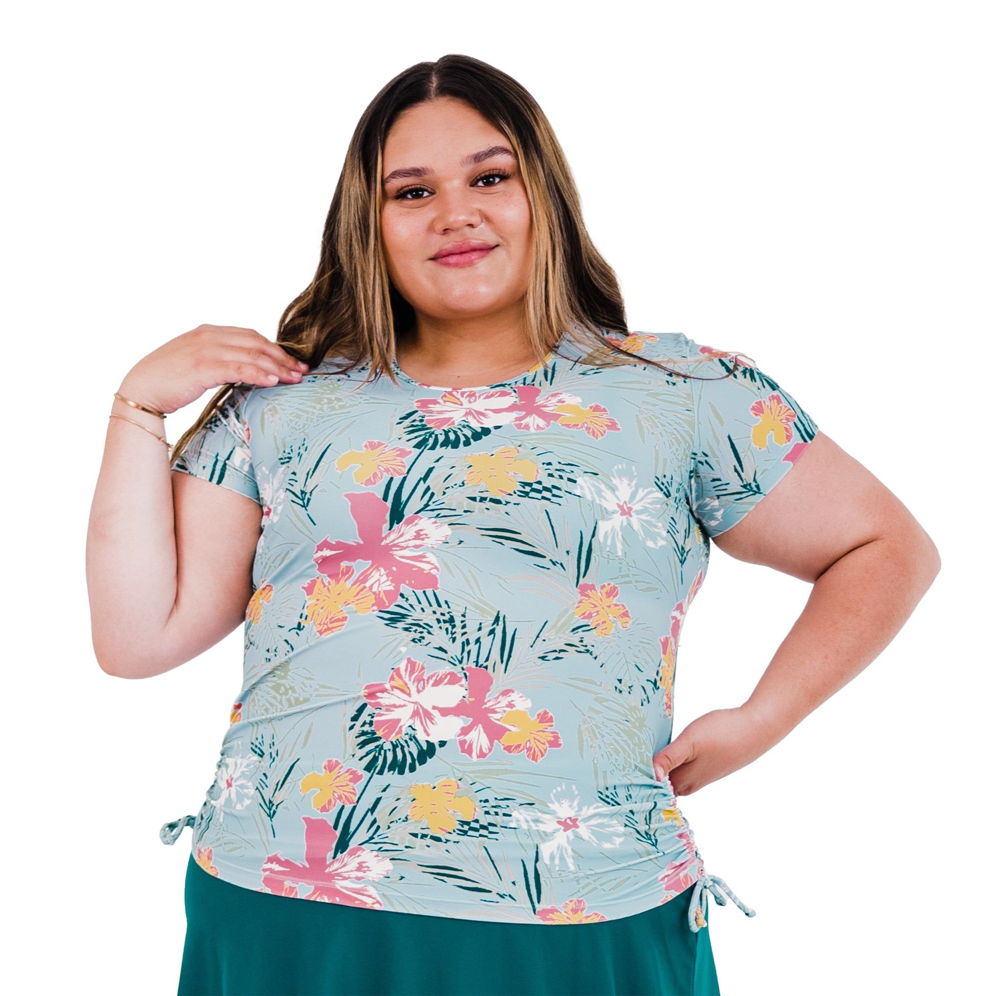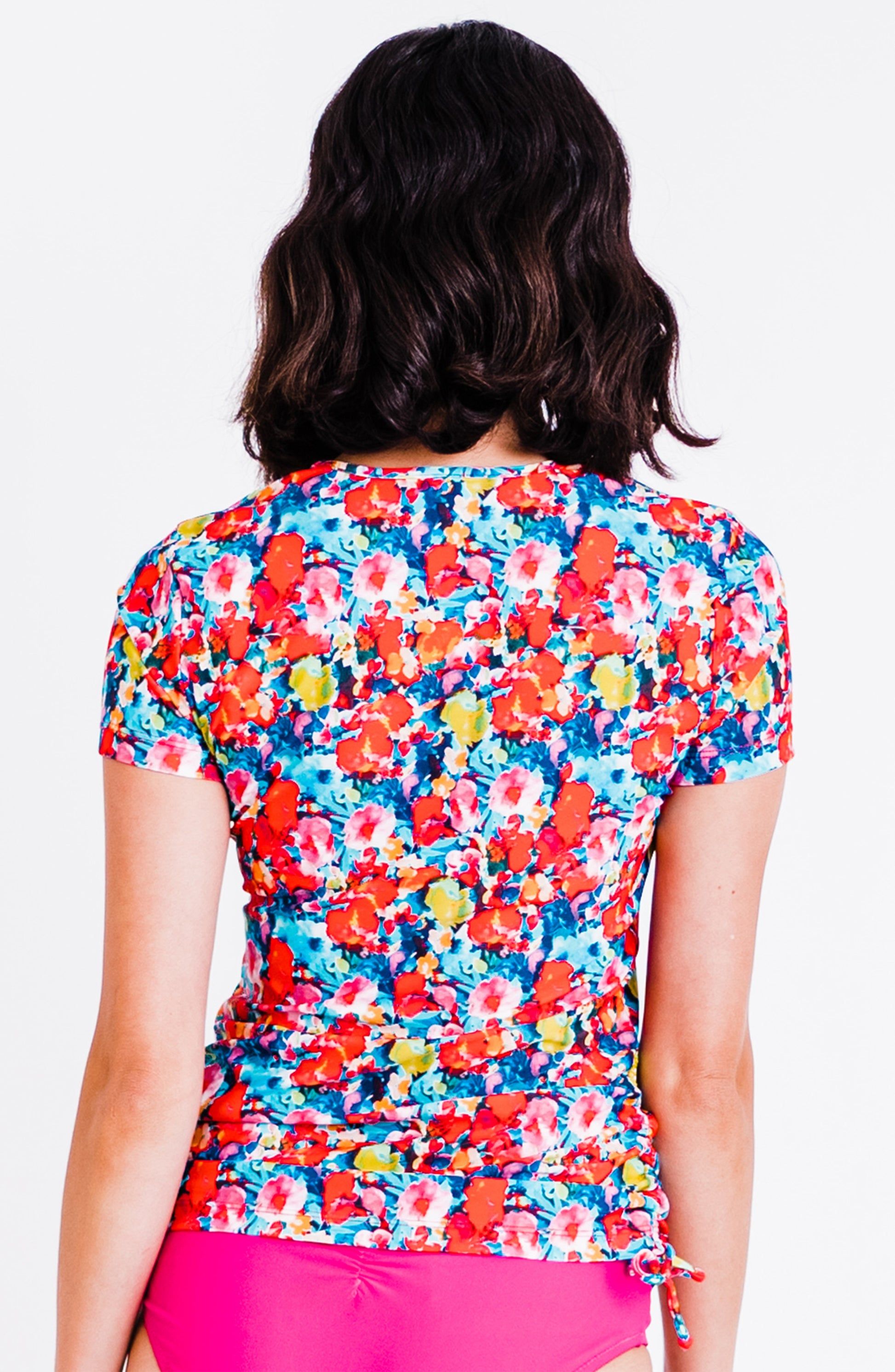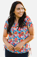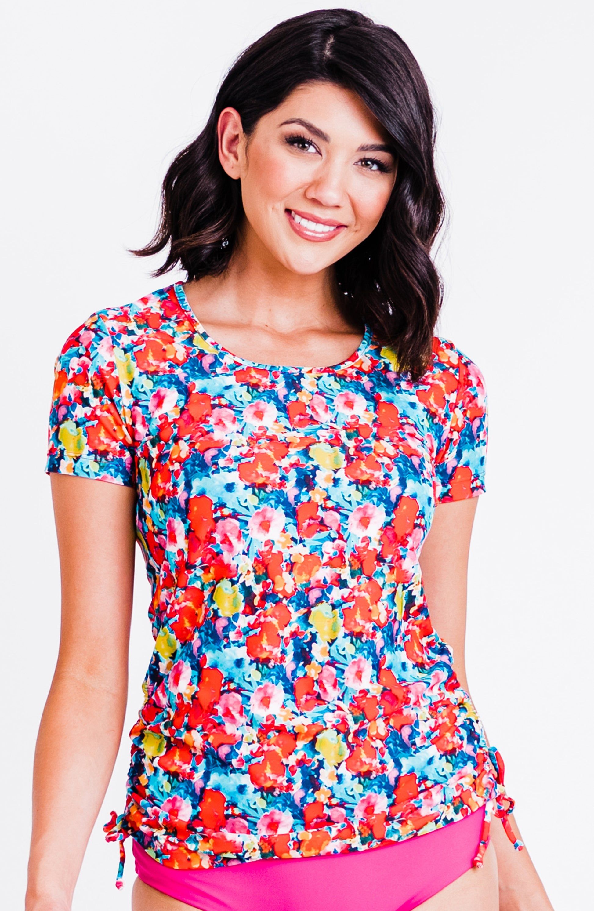 Beat the heat and the sun with the Short Sleeve Adele Swim Top! This stylish crew neck with adjustable side ruching is perfect for the pool, beach, or running around on a sunny day - did we mention it also has UPF 50+ sun protection? Sold as top only. Pair with your favorite swim bottom to complete the look.