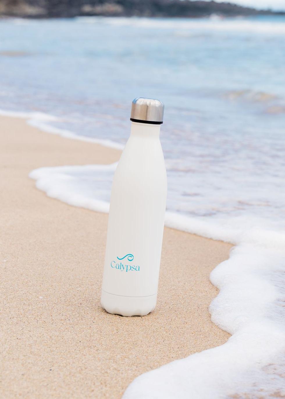 This sleek stainless steel water bottle keeps your drinks cold and your beach vibes strong. Lightweight, durable, and perfect for life on the go — with a leak-proof cap and a clean Calypsa finish.