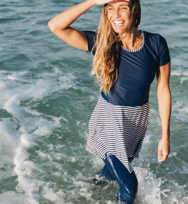 This fun and modest swim dress is the perfect thing to wear to the beach! Look cute and fashionable in our multitude of prints and patterns but stay modestly covered. This product does not have a built in bra. Pair it with your favorite swim bottoms to complete the look.